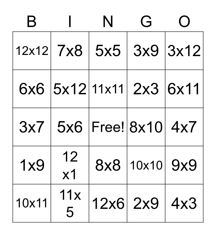 This bingo card has a free space and 24 words: 12 x1, 11x 5, 11x11, 10x11, 3x12, 12x12, 6x6, 7x8, 8x10, 8x8, 2x3, 3x7, 10x10, 9x9, 5x12, 2x9, 4x7, 5x5, 6x11, 5x6, 4x3, 1x9, 3x9 and 12x6.