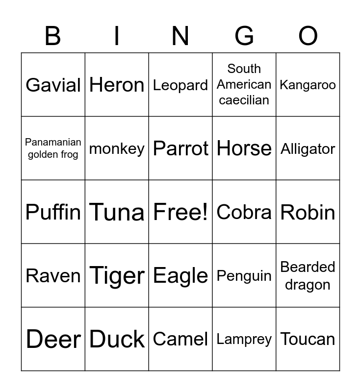 This bingo card has a free space and 93 words: Mammals, Bear, Camel, Cat, Chimpanzee, Chinchilla, Cow, Deer, Dog, Elephant, Giraffe, Gorilla, Hippopotamus, Horse, Human, Kangaroo, Leopard, Lynx, Mouse, Platypus, Rabbit, Rat, Rhinoceros, Sheep, Tiger, monkey, Birds:, Canary, Crane, Dove, Duck, Eagle, Flamingo, Goldfinch, Heron, Hummingbird, Owl, Parakeet, Parrot, Penguin, Puffin, Raven, Robin, Shoebill, Toucan, Fish:, Anglerfish, Betta fish, Catfish, Eel, Goldfish, Lamprey, Lungfish, Mudskipper, Pufferfish, Ray, Sea dragon, Seahorse, Shark, Swordfish, Tuna, Amphibians:, Chinese giant salamander, Common frog, European fire-bellied toad, Goliath frog, Iberian ribbed newt, Leaf green tree frog, Panamanian golden frog, Pool frog, Red-eyed tree frog, Rough-skinned newt, Spotted salamander, South American caecilian, Tiger salamander, Reptiles:, Alligator, Bearded dragon, Blind snake, Boa, Caiman, Crocodile, Cobra, Gavial, Iguana, Komodo dragon, Legless lizard, Rattlesnake, Tortoise, Tuatara, Turtle, Viper and Worm lizard.