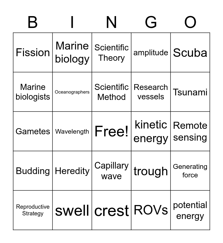 This bingo card has a free space and 24 words: Reproductive Strategy, Heredity, Scientific Method, ROVs, Scuba, Fission, Marine biology, Scientific Theory, kinetic energy, Remote sensing, Gametes, Oceanographers, trough, Generating force, Marine biologists, swell, crest, amplitude, Tsunami, Budding, Wavelength, Capillary wave, Research vessels and potential energy.