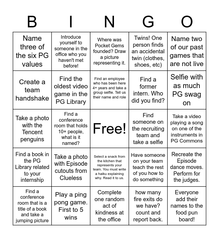 This bingo card has a free space and 24 words: Take a photo with Episode cutouts from Clueless, Play a ping pong game. First to 5 wins, Find an employee who has been here 4+ years and take a group selfie. Tell us their name and role, Find a conference room that is a title of a book and take a jumping picture, Name two of our past games that are not live, Name three of the six PG values, Create a team handshake, Introduce yourself to someone in the office who you haven't met before!, Find someone on the recruiting team and take a selfie, Select a snack from the kitchen that represents your team. You must write a haiku explaining why. Read it to us., Find a former intern. Who did you find?, Take a photo with the Tencent penguins, Have someone on your team teach the rest of you how to do something, Recreate the Episode dance moves. Perform for the judges., Find the oldest video game in the PG Library, how many fire exits do we have? count and report back., Take a video playing a song on one of the instruments in PG Commons, Where was Pocket Gems founded? Draw a picture representing it., Selfie with as much PG swag on, Find a conference room that holds 10+ people, what is it named?, Everyone add their names to the food pun board!, Find a book in the PG Library related to your internship, Twins! One person finds an accidental twin (clothes, shoes, etc) and Complete one random act of kindness at the office.