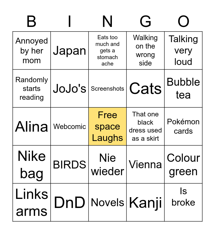 This bingo card has a free space and 37 words: Peppa pig, Minions, Doesn't know where to eat, That one black dress used as a skirt, Pokémon cards, Nike bag, Webcomic, Random singing, Cats, Tissues, Randomly starts reading, JoJo's, Kanji, Talking very loud, Annoyed by her mom, DnD, Nie wieder, Walking on the wrong side, Bubble tea, Alina, Japan, Screenshots, Being BI for 2D characters, Colour green, Brushing her hair, Cooking, Eats too much and gets a stomach ache, Being dragged away from Manga, Some bl, Gold jewelry, Iced/ sweet tea, Novels, Vienna, Is broke, Links arms, BIRDS and Barbie.