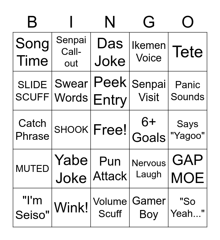 This bingo card has a free space and 24 words: Yabe Joke, Wink!, Peek Entry, "I'm Seiso", Tete, Song Time, SLIDE SCUFF, Senpai Call-out, 6+ Goals, Pun Attack, Senpai Visit, Catch Phrase, Nervous Laugh, GAP MOE, Swear Words, Gamer Boy, Says "Yagoo", Das Joke, Panic Sounds, SHOOK, "So Yeah...", MUTED, Ikemen Voice and Volume Scuff.