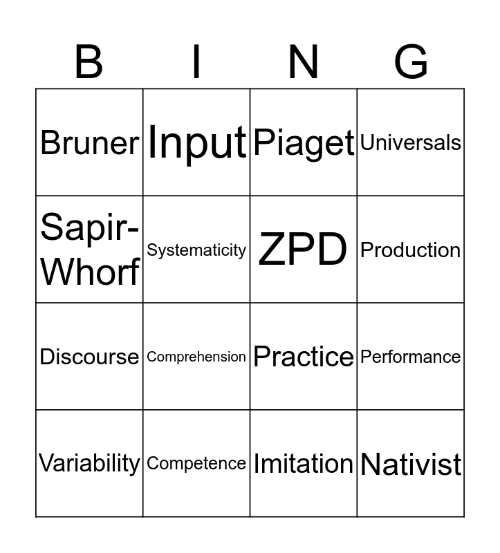 This bingo card has 16 words: Competence, Performance, Piaget, Bruner, Discourse, Input, Practice, Imitation, Sapir-Whorf, Systematicity, Variability, Universals, Comprehension, Production, ZPD and Nativist.