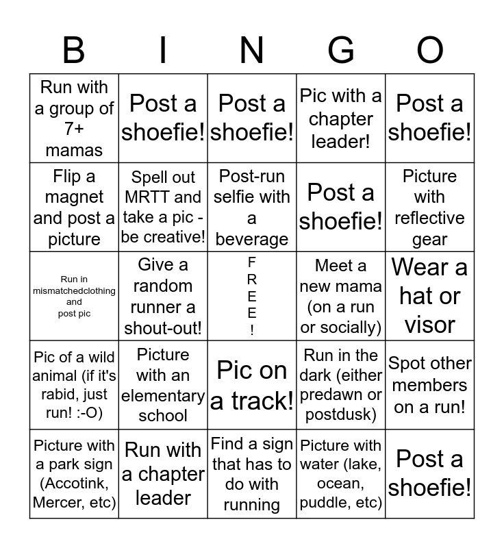 This bingo card has a free space and 24 words: Picture with an elementary school, Run with a chapter leader, Post-run selfie with a beverage, Picture with a park sign (Accotink, Mercer, etc), Post a shoefie!, Run with a group of 7+ mamas, Flip a magnet and post a picture, Post a shoefie!, Meet a new mama (on a run or socially), Pic on a track!, Post a shoefie!, Run in mismatchedclothing and post pic, Run in the dark (either predawn or postdusk), Spot other members on a run!, Spell out MRTT and take a pic - be creative!, Picture with water (lake, ocean, puddle, etc), Wear a hat or visor, Post a shoefie!, Picture with reflective gear, Give a random runner a shout-out!, Post a shoefie!, Pic of a wild animal (if it's rabid, just run! :-O), Pic with a chapter leader! and Find a sign that has to do with running.