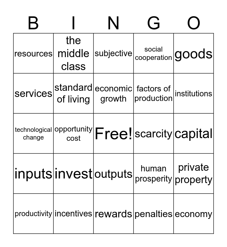 This bingo card has a free space and 24 words: invest, incentives, economic growth, productivity, goods, resources, services, the middle class, scarcity, outputs, factors of production, technological change, human prosperity, private property, standard of living, penalties, capital, subjective, institutions, opportunity cost, economy, inputs, social cooperation and rewards.