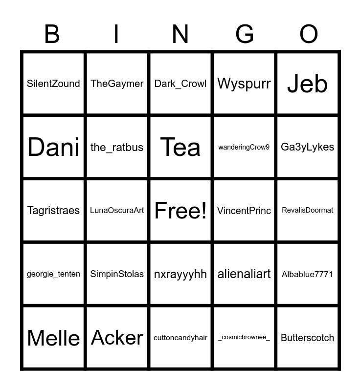 This bingo card has a free space and 24 words: SimpinStolas, Acker, Tea, Melle, Jeb, SilentZound, Dani, TheGaymer, VincentPrinc, nxrayyyhh, wanderingCrow9, Tagristraes, alienaliart, Albablue7771, the_ratbus, _cosmicbrownee_, RevalisDoormat, Dark_Crowl, Ga3yLykes, LunaOscuraArt, Butterscotch, georgie_tenten, Wyspurr and cuttoncandyhair.