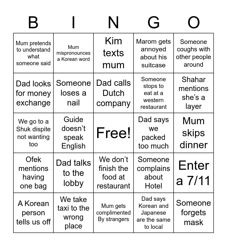 This bingo card has a free space and 37 words: Lotte is seen, Restaurant with only one meal, Mum talks to locals, Someone loses a nail, Enter a 7/11, Dad talks to the lobby, Dad calls Dutch company, Agam gets annoyed at someone not doing Korean culture, Someone coughs with other people around, Ofek gets blamed for making family sick, Guide doesn’t speak English, Marom gets annoyed about his suitcase, Someone forgets mask, Mum skips dinner, Dad looks for money exchange, Ofek mentions having one bag, Marom carries coat but it doesn’t rain, Kim texts mum, We don’t finish the food at restaurant, Dad says we packed too much, Mum pretends to understand what someone said, Shahar mentions she’s a layer, A Korean person tells us off, Mum gets complimented By strangers, Marom secretly Convinces someone to buy what he wants, Dad says Korean and Japanese are the same to local, Mum mispronounces a Korean word, Food is too spicy, Ofek mentions he’s moving house, Mum mentions Fenja, Shahar mentions her Instagram, We take taxi to the wrong place, We go to a Shuk dispite not wanting too, Someone takes a nap in the middle of the day, Someone complains about Hotel, Someone stops to eat at a western restaurant and Dad takes his mask off to speak.