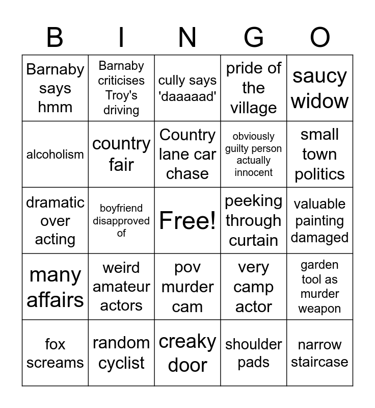 This bingo card has a free space and 24 words: weird amateur actors, random cyclist, Country lane car chase, fox screams, saucy widow, Barnaby says hmm, alcoholism, Barnaby criticises Troy's driving, peeking through curtain, pov murder cam, obviously guilty person actually innocent, dramatic over acting, very camp actor, garden tool as murder weapon, country fair, shoulder pads, valuable painting damaged, cully says 'daaaaad', small town politics, boyfriend disapproved of, narrow staircase, many affairs, pride of the village and creaky door.