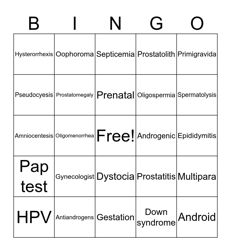 This bingo card has a free space and 24 words: Gynecologist, Antiandrogens, Prenatal, HPV, Primigravida, Hysterorrhexis, Pseudocyesis, Oophoroma, Androgenic, Dystocia, Oligospermia, Amniocentesis, Prostatitis, Multipara, Prostatomegaly, Down syndrome, Epididymitis, Septicemia, Spermatolysis, Oligomenorrhea, Android, Pap test, Prostatolith and Gestation.