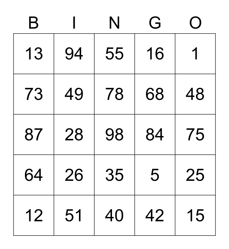 This bingo card has 25 words: 26, 40, 78, 12, 1, 13, 73, 94, 84, 35, 68, 87, 5, 25, 49, 15, 75, 55, 48, 28, 98, 51, 64, 16 and 42.