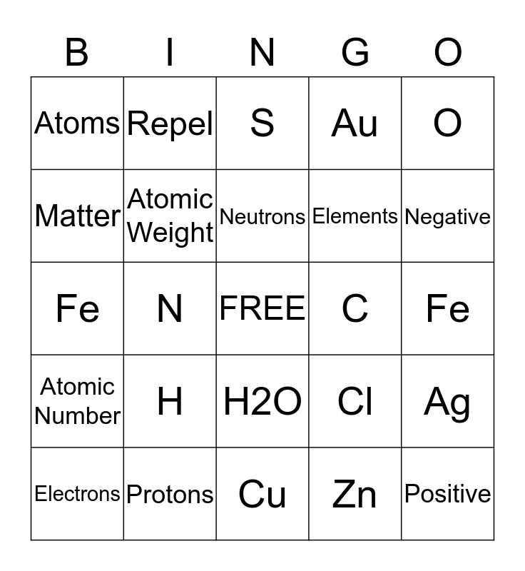 This bingo card has a free space and 24 words: H, Protons, Neutrons, Electrons, O, Atoms, Matter, Repel, C, H2O, Elements, Fe, Cl, Ag, Atomic Weight, Zn, Fe, S, Negative, N, Positive, Atomic Number, Au and Cu.