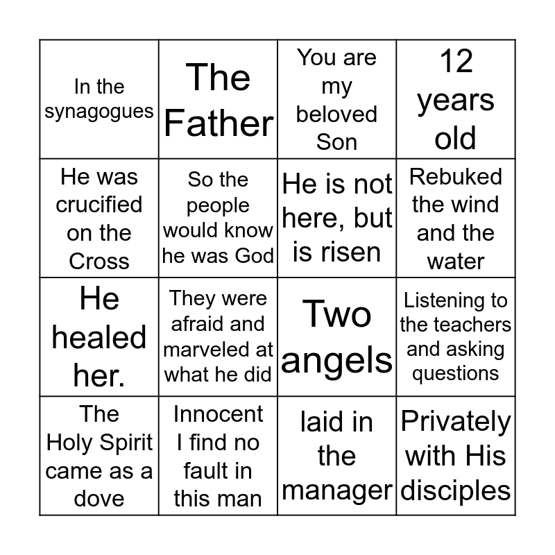 This bingo card has a free space and 15 words: The Holy Spirit came as a dove, Privately with His disciples, You are my beloved Son, In the synagogues, Rebuked the wind and the water, He was crucified on the Cross, They were afraid and marveled at what he did, laid in the manager, So the people would know he was God, He healed her., Listening to the teachers and asking questions, 12 years old, He is not here, but is risen, The Father and Innocent I find no fault in this man.