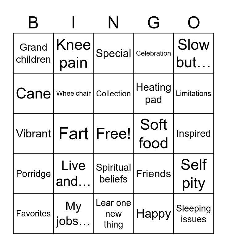 This bingo card has a free space and 42 words: Night light, Collection, New hobbies, Live and…, Happy, Self pity, Sleeping issues, Unique, Special, Spiritual beliefs, Inspired, Limitations, Fart, Slow but…, Pillbox, Friends, Difficulty, Vibrant, Free, Knee pain, Cane, Exercising, One of a kind, Grand children, Fun, Bifocals, Heating pad, Dentures, Arthritis, Walker, Chicken soup, Porridge, Wheelchair, Lear one new thing, What family means, Favorites, My jobs…, Soft food, Poor eyesight, One of a kind, Celebration and Memory loss.