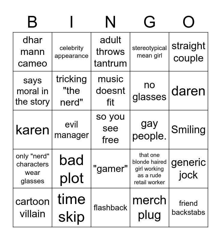 This bingo card has a free space and 28 words: generic jock, no black characters/only bg, no glasses, merch plug, says moral in the story, adult throws tantrum, celebrity appearance, only "nerd" characters wear glasses, gay people., cartoon villain, karen, stereotypical mean girl, time skip, flashback, daren, poor=smart rich= dumb, bad plot, tricking "the nerd", music doesnt fit, "gamer", dhar mann cameo, obvious 30 year old acting as a teen, friend backstabs, evil manager, Smiling, that one blonde haired girl working as a rude retail worker, straight couple and racist woman trying to steal a ps5.