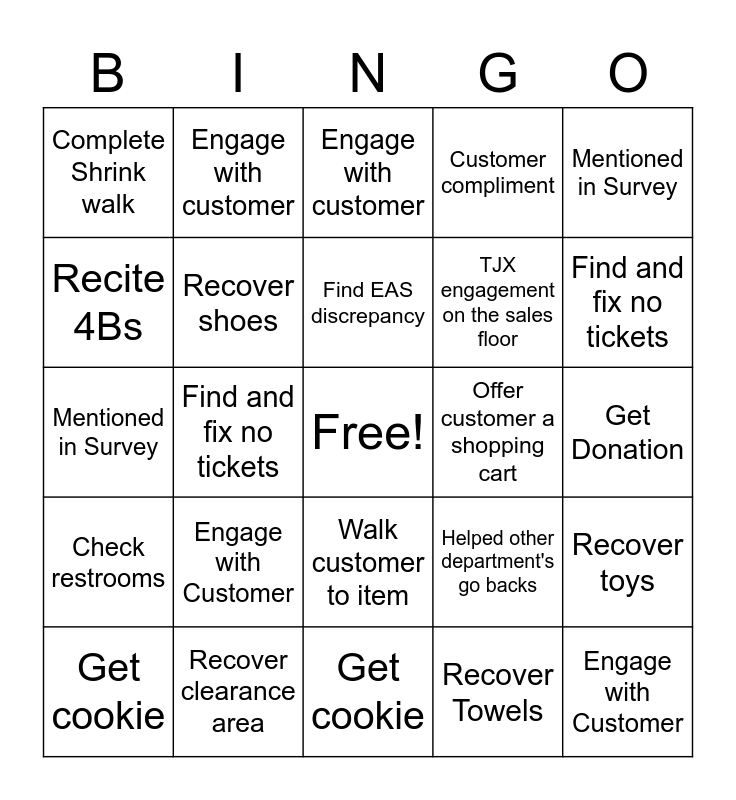 This bingo card has a free space and 24 words: Engage with Customer, Recover clearance area, Find EAS discrepancy, Get cookie, Mentioned in Survey, Complete Shrink walk, Recite 4Bs, Engage with customer, Offer customer a shopping cart, Walk customer to item, TJX engagement on the sales floor, Mentioned in Survey, Helped other department's go backs, Recover toys, Recover shoes, Recover Towels, Get Donation, Engage with customer, Find and fix no tickets, Find and fix no tickets, Engage with Customer, Check restrooms, Customer compliment and Get cookie.