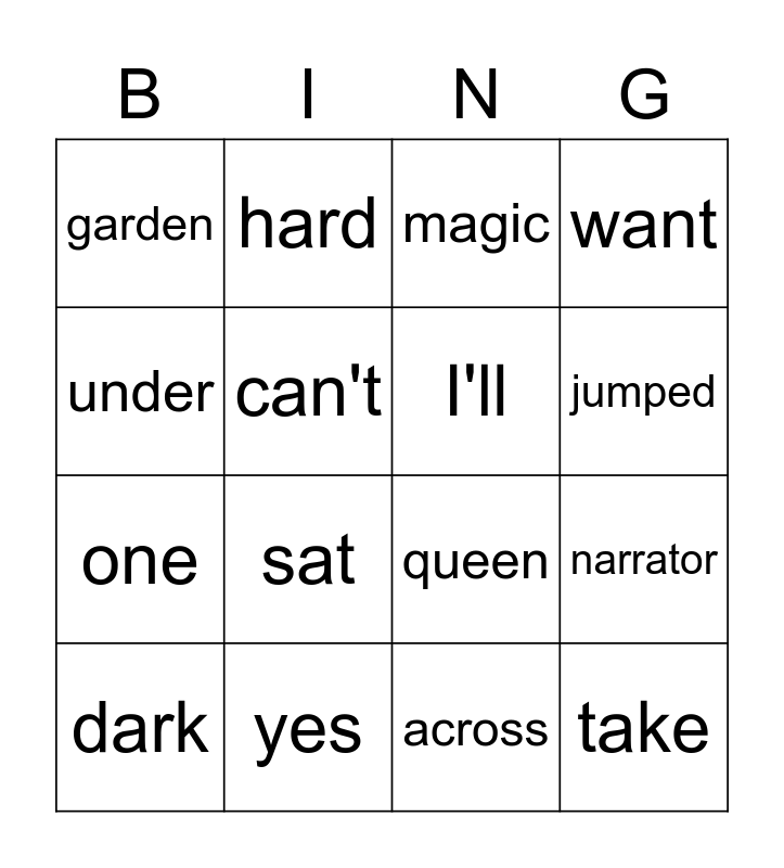 This bingo card has 23 words: take, park, jumped, rabbit, under, garden, can't, hard, dark, baby, sat, one, keep, last, yes, fast, magic, queen, I'll, narrator, want, across and each.