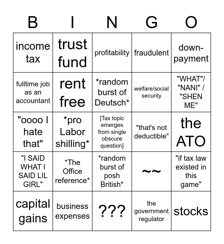 This bingo card has a free space and 24 words: *The Office reference*, business expenses, *random burst of Deutsch*, capital gains, down-payment, income tax, fulltime job as an accountant, trust fund, "that's not deductible", *random burst of posh British*, welfare/social security, "oooo I hate that", ~~, "if tax law existed in this game", rent free, the government regulator, the ATO, profitability, "WHAT"/ "NANI" / "SHEN ME", *pro Labor shilling*, stocks, "I SAID WHAT I SAID LIL GIRL", fraudulent and ???.