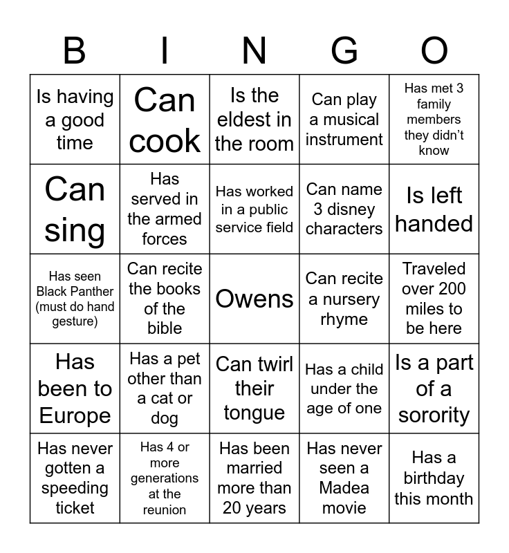 This bingo card has a free space and 24 words: Has a pet other than a cat or dog, Has 4 or more generations at the reunion, Has worked in a public service field, Has never gotten a speeding ticket, Has met 3 family members they didn’t know, Is having a good time, Can sing, Can cook, Can recite a nursery rhyme, Can twirl their tongue, Can name 3 disney characters, Has seen Black Panther (must do hand gesture), Has a child under the age of one, Is a part of a sorority, Has served in the armed forces, Has never seen a Madea movie, Traveled over 200 miles to be here, Is the eldest in the room, Is left handed, Can recite the books of the bible, Has a birthday this month, Has been to Europe, Can play a musical instrument and Has been married more than 20 years.