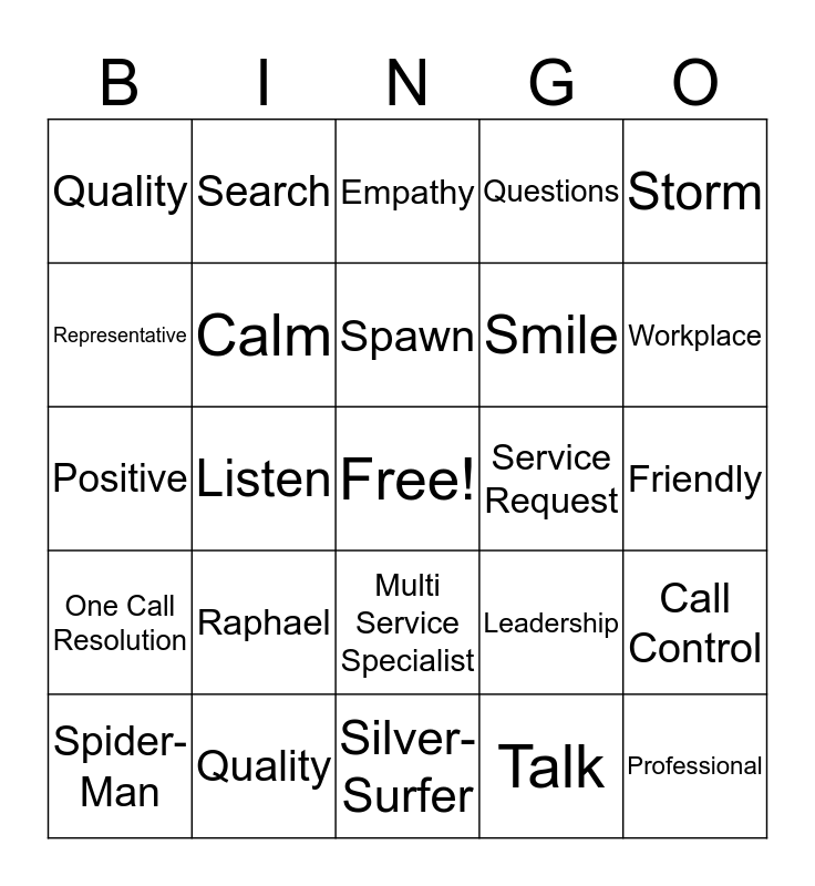 This bingo card has a free space and 25 words: Raphael, Silver-Surfer, Spawn, Spider-Man, Storm, Quality, Representative, Search, Service Request, Multi Service Specialist, Smile, Positive, Leadership, Call Control, Calm, Thank you, Friendly, Empathy, Workplace, Listen, Professional, Quality, One Call Resolution, Questions and Talk.