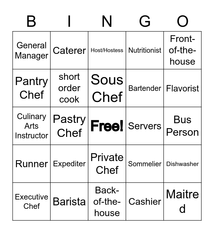 This bingo card has a free space and 24 words: Expediter, Barista, Sous Chef, Executive Chef, Front-of-the-house, General Manager, Pantry Chef, Caterer, Servers, Private Chef, Bartender, Culinary Arts Instructor, Sommelier, Dishwasher, short order cook, Cashier, Bus Person, Host/Hostess, Flavorist, Pastry Chef, Maitre d, Runner, Nutritionist and Back-of-the-house.