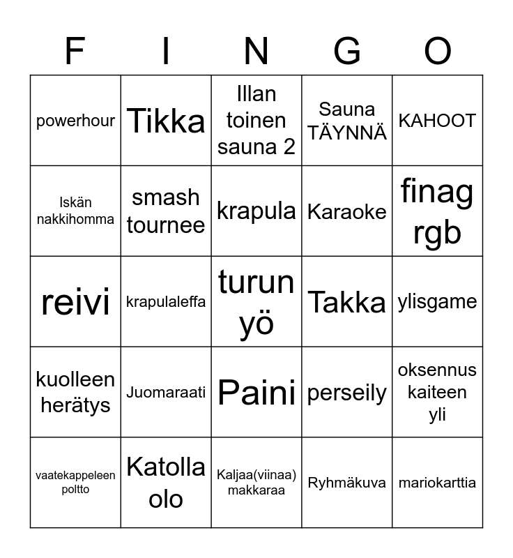 This bingo card has 25 words: Juomaraati, Kaljaa(viinaa) makkaraa, krapula, vaatekappeleen poltto, KAHOOT, powerhour, Iskän nakkihomma, Tikka, Takka, Paini, Karaoke, reivi, perseily, oksennus kaiteen yli, smash tournee, mariokarttia, ylisgame, Illan toinen sauna 2, finag rgb, krapulaleffa, turun yö, Katolla olo, kuolleen herätys, Sauna TÄYNNÄ and Ryhmäkuva.