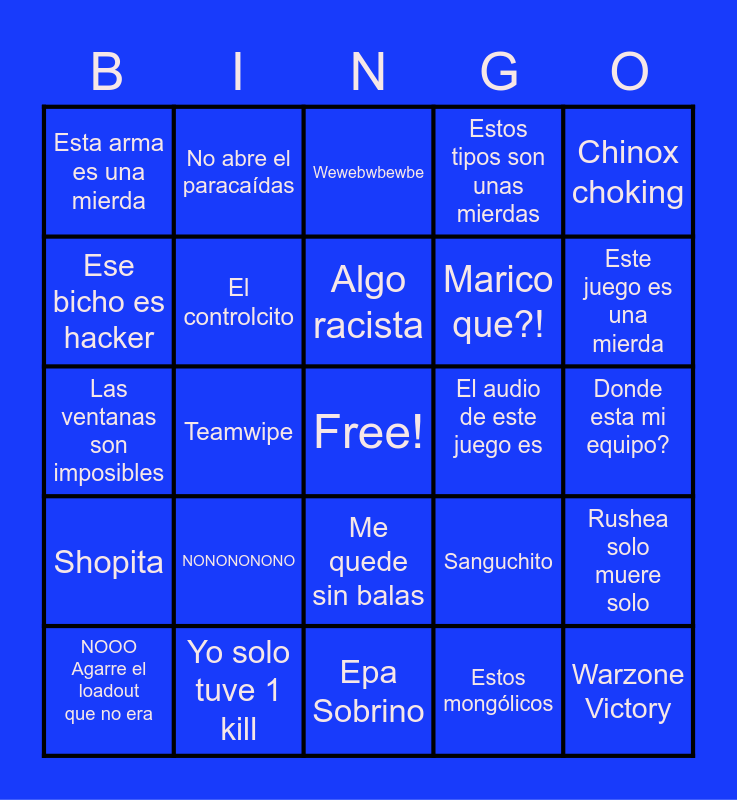 This bingo card has a free space and 24 words: NOOO Agarre el loadout que no era, NONONONONO, Algo racista, Estos mongólicos, Chinox choking, Esta arma es una mierda, No abre el paracaídas, Wewebwbewbe, El audio de este juego es, Donde esta mi equipo?, Las ventanas son imposibles, El controlcito, Sanguchito, Rushea solo muere solo, Ese bicho es hacker, Yo solo tuve 1 kill, Epa Sobrino, Estos tipos son unas mierdas, Este juego es una mierda, Shopita, Teamwipe, Me quede sin balas, Marico que?! and Warzone Victory.