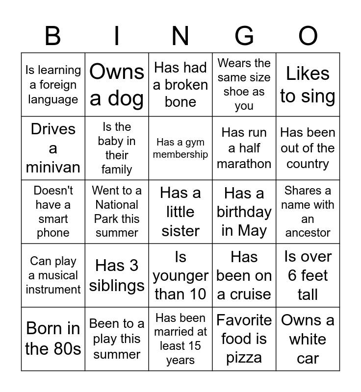 This bingo card has 25 words: Has 3 siblings, Has been married at least 15 years, Has a gym membership, Born in the 80s, Likes to sing, Is learning a foreign language, Drives a minivan, Owns a dog, Has a birthday in May, Is younger than 10, Has run a half marathon, Doesn't have a smart phone, Has been on a cruise, Is over 6 feet tall, Is the baby in their family, Owns a white car, Shares a name with an ancestor, Has had a broken bone, Has been out of the country, Went to a National Park this summer, Has a little sister, Been to a play this summer, Can play a musical instrument, Wears the same size shoe as you and Favorite food is pizza.