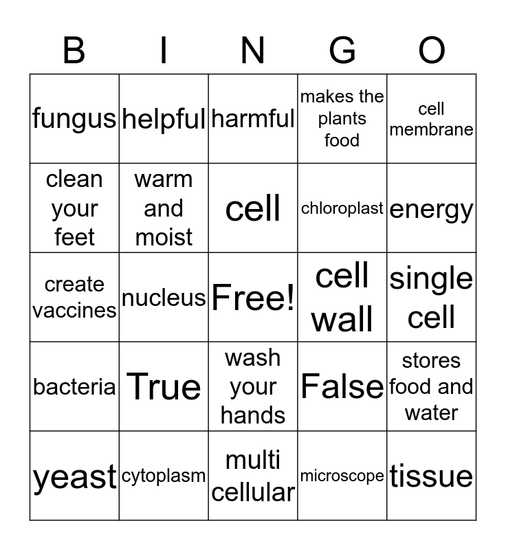 This bingo card has a free space and 24 words: True, cytoplasm, cell, yeast, cell membrane, fungus, clean your feet, helpful, cell wall, wash your hands, chloroplast, create vaccines, False, stores food and water, warm and moist, microscope, single cell, harmful, energy, nucleus, tissue, bacteria, makes the plants food and multi cellular.