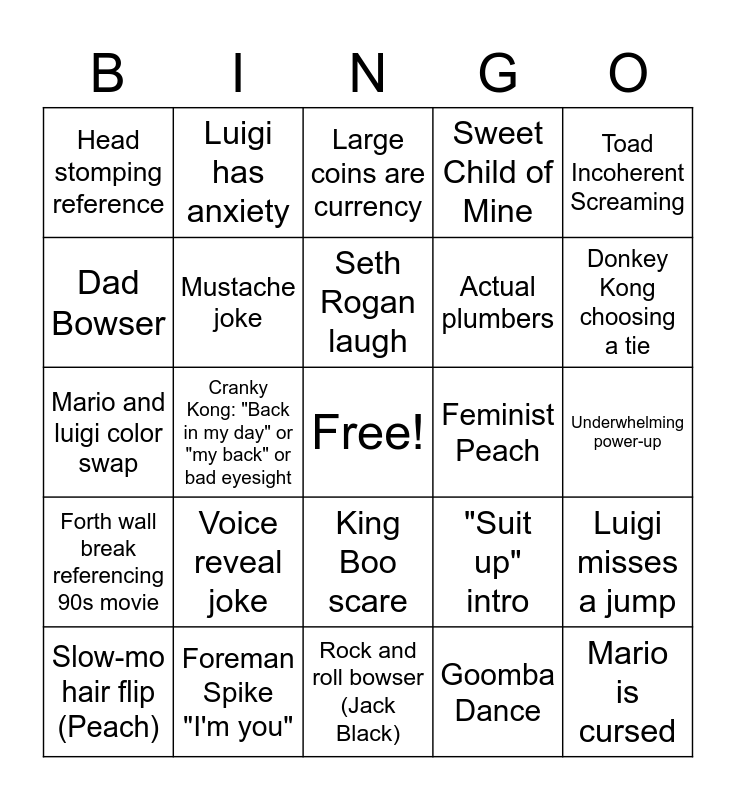 This bingo card has a free space and 25 words: Voice reveal joke, Rock and roll bowser (Jack Black), Seth Rogan laugh, Slow-mo hair flip (Peach), Toad Incoherent Screaming, Head stomping reference, Dad Bowser, Luigi has anxiety, Feminist Peach, King Boo scare, Actual plumbers, Mario and luigi color swap, "Suit up" intro, Luigi misses a jump, Mustache joke, Riding a bullet bill, Underwhelming power-up, Large coins are currency, Donkey Kong choosing a tie, Cranky Kong: "Back in my day" or "my back" or bad eyesight, Mario is cursed, Foreman Spike "I'm you", Forth wall break referencing 90s movie, Sweet Child of Mine and Goomba Dance.