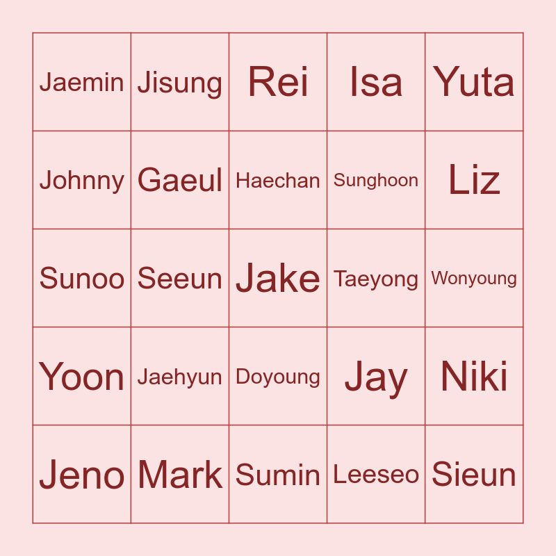 This bingo card has a free space and 24 words: Jaehyun, Mark, Haechan, Jeno, Yuta, Jaemin, Johnny, Jisung, Taeyong, Doyoung, Sunghoon, Sunoo, Jay, Niki, Gaeul, Leeseo, Wonyoung, Rei, Liz, Seeun, Sieun, Yoon, Isa and Sumin.