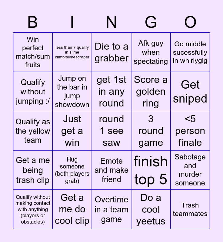 This bingo card has a free space and 24 words: Hug someone (both players grab), Get a me do cool clip, get 1st in any round, Qualify without making contact with anything (players or obstacles), Go middle sucessfully in whirlygig, Win perfect match/sum fruits, Qualify without jumping :/, less than 7 qualify in slime climb/slimescraper, 3 round game, Emote and make friend, Score a golden ring, Qualify as the yellow team, finish top 5, Sabotage and murder someone, Jump on the bar in jump showdown, Do a cool yeetus, <5 person finale, Die to a grabber, Get sniped, Just get a win, Trash teammates, Get a me being trash clip, Afk guy when spectating and Overtime in a team game.