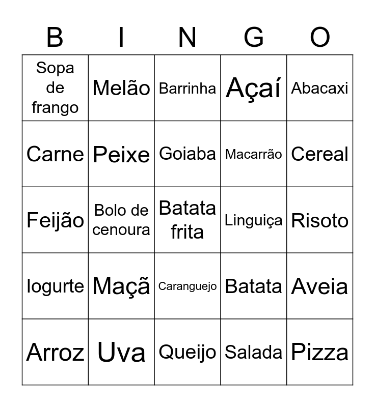 This bingo card has a free space and 24 words: Maçã, Uva, Goiaba, Arroz, Abacaxi, Sopa de frango, Carne, Melão, Linguiça, Caranguejo, Macarrão, Feijão, Batata, Aveia, Peixe, Salada, Risoto, Barrinha, Cereal, Bolo de cenoura, Pizza, Iogurte, Açaí and Queijo.