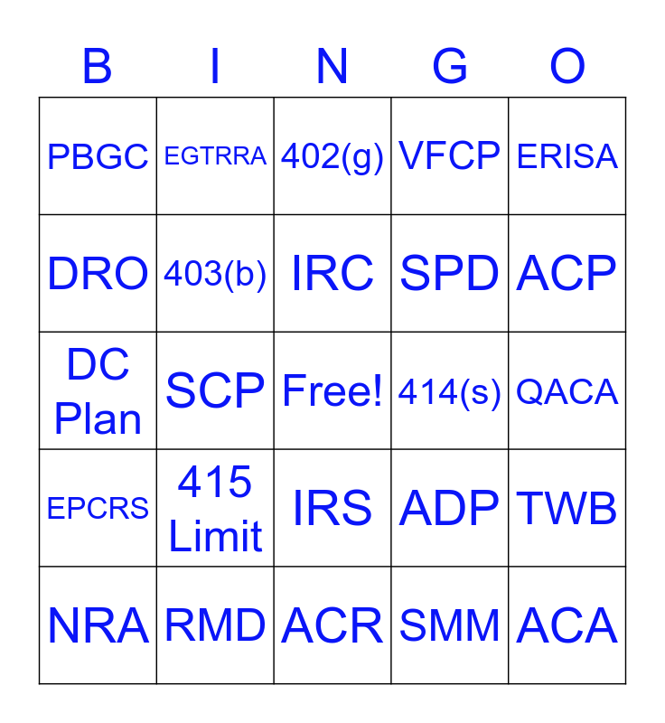 This bingo card has a free space and 40 words: DB Plan, DC Plan, 401(k), 403(b), RMD, IRS, IRC, DOL, ERISA, EPCRS, SCP, VFCP, ACA, QACA, 414(s), 415 Limit, 404(c), PBGC, COLA Limits, 402(g), TWB, SMM, SPD, DRO, NRA, HCE, NHCE, TPA, QDIA, QNEC, QMAC, NRA, QJ&SA, ADP, ACP, ACR, EBSA, Rev. Proc, EGTRRA and MEP.