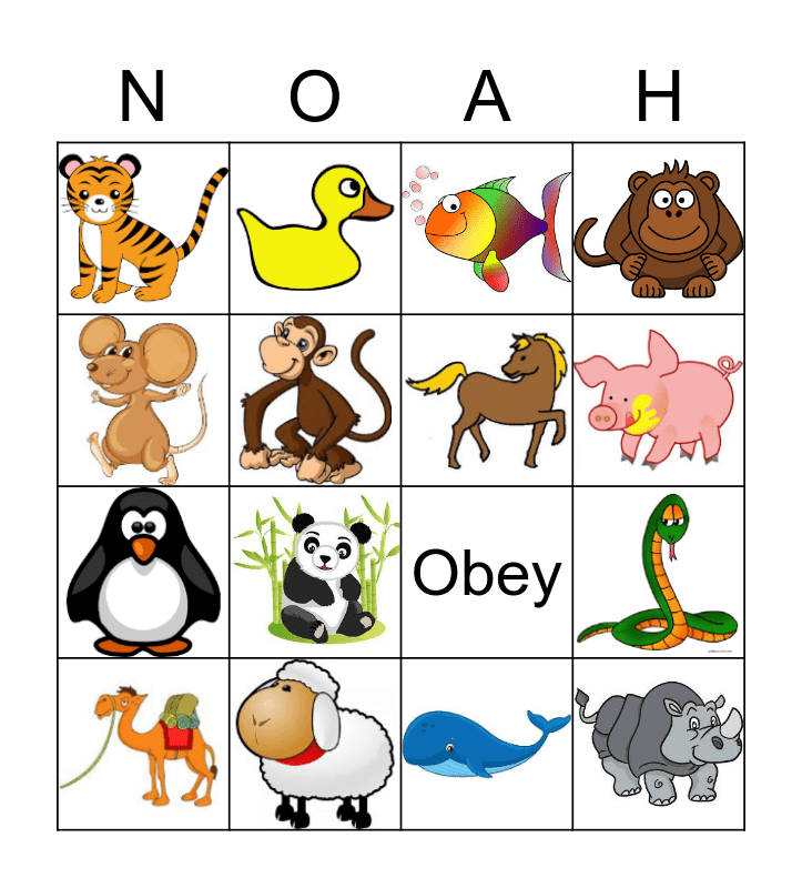 This bingo card has 44 images and 8 words: Flood, Dove, Genisis, Obey, God, Altar, Rainbow and Prayer.