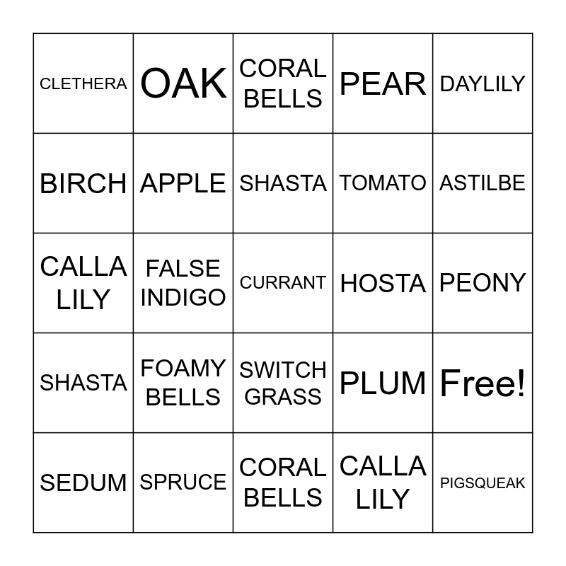 ⚠ This card has duplicate items: ASTILBE (2), CURRANT (2), SEDUM (2), CORAL BELLS (2), FOAMY BELLS (2), SPIREA (2), OAK (2), MUMS (2), BIRCH (2), SPRUCE (2), APPLE (2), PEAR (2), PLUM (2), BEE BALM (2), PEONY (2), SHASTA (2), HOSTA (2), ASIATIC LILY (2), DAYLILY (2), FALSE INDIGO (2), CALLA LILY (2), CLETHERA (2), TOMATO (2), SWITCH GRASS (2), PIGSQUEAK (2)