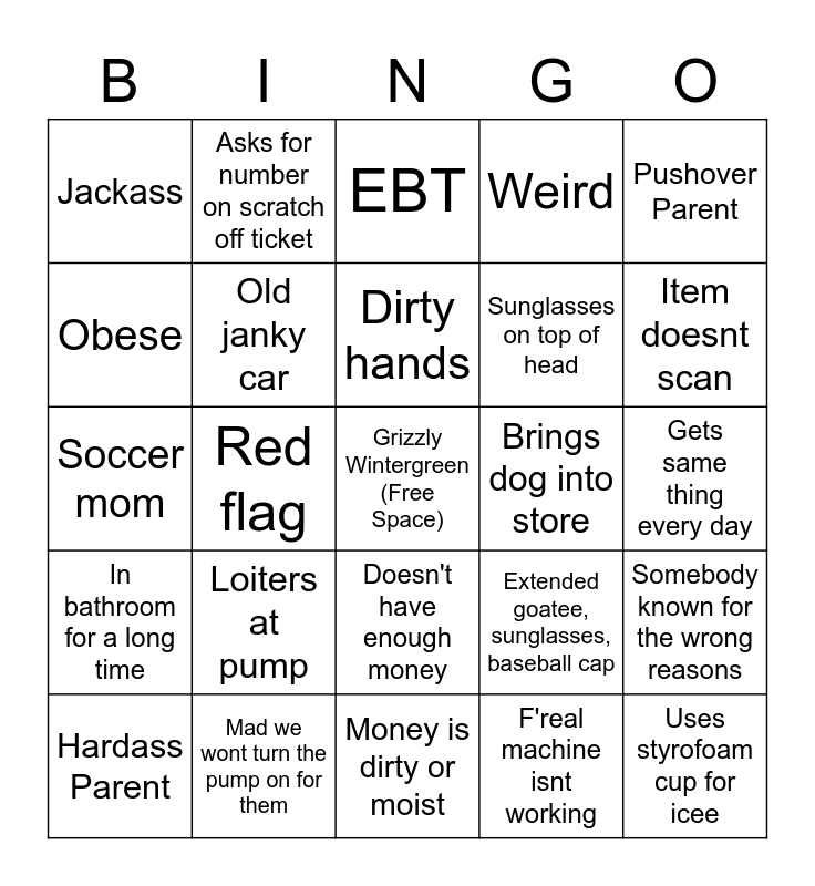 This bingo card has a free space and 24 words: Loiters at pump, Mad we wont turn the pump on for them, Dirty hands, Hardass Parent, Pushover Parent, Jackass, Obese, Asks for number on scratch off ticket, Brings dog into store, Doesn't have enough money, Sunglasses on top of head, Soccer mom, Extended goatee, sunglasses, baseball cap, Somebody known for the wrong reasons, Old janky car, F'real machine isnt working, Gets same thing every day, EBT, Item doesnt scan, Red flag, Uses styrofoam cup for icee, In bathroom for a long time, Weird and Money is dirty or moist.