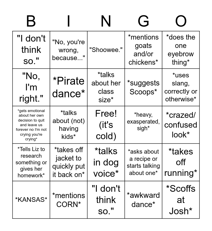 This bingo card has a free space and 24 words: *takes off jacket to quickly put it back on*, *mentions CORN*, *talks about her class size*, *KANSAS*, *does the one eyebrow thing*, "I don't think so.", "No, I'm right.", "No, you're wrong, because...", *heavy, exasperated, sigh*, *talks in dog voice*, *suggests Scoops*, *gets emotional about her own decision to quit and leave us forever no I'm not crying you're crying*, *asks about a recipe or starts talking about one*, *takes off running*, *Pirate dance*, *awkward dance*, *crazed/ confused look*, "Shoowee.", *uses slang, correctly or otherwise*, *talks about (not) having kids*, *Scoffs at Josh*, *Tells Liz to research something or gives her homework*, *mentions goats and/or chickens* and "I don't think so.".