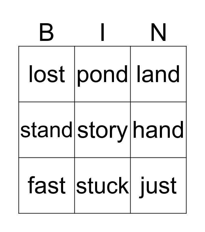 This bingo card has a free space and 8 words: hand, land, pond, fast, lost, just, stand and stuck.