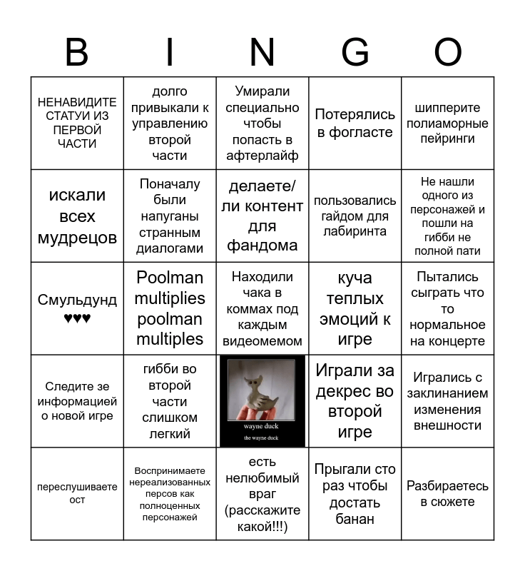 This bingo card has 1 images and 24 words: гибби во второй части слишком легкий, есть нелюбимый враг (расскажите какой!!!), делаете/ли контент для фандома, переслушиваете ост, шипперите полиаморные пейринги, НЕНАВИДИТЕ СТАТУИ ИЗ ПЕРВОЙ ЧАСТИ, искали всех мудрецов, долго привыкали к управлению второй части, куча теплых эмоций к игре, пользовались гайдом для лабиринта, Смульдунд ♥♥♥, Играли за декрес во второй игре, Игрались с заклинанием изменения внешности, Поначалу были напуганы странным диалогами, Разбираетесь в сюжете, Пытались сыграть что то нормальное на концерте, Умирали специально чтобы попасть в афтерлайф, Не нашли одного из персонажей и пошли на гибби не полной пати, Poolman multiplies poolman multiples, Находили чака в коммах под каждым видеомемом, Воспринимаете нереализованных персов как полноценных персонажей, Следите зе информацией о новой игре, Потерялись в фогласте and Прыгали сто раз чтобы достать банан.