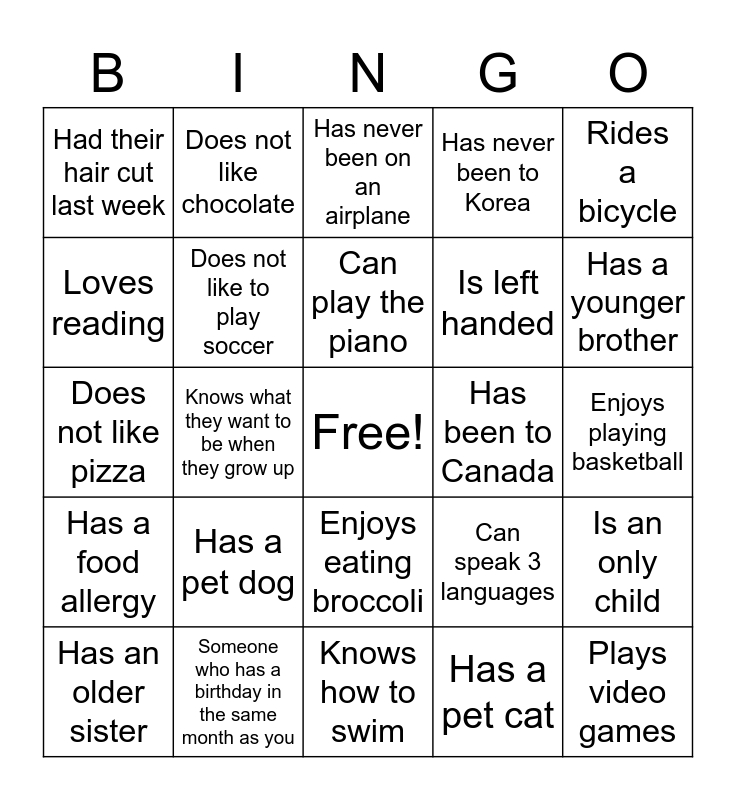 This bingo card has a free space and 24 words: Has a pet dog, Someone who has a birthday in the same month as you, Can play the piano, Has an older sister, Rides a bicycle, Had their hair cut last week, Loves reading, Does not like chocolate, Has been to Canada, Enjoys eating broccoli, Is left handed, Does not like pizza, Can speak 3 languages, Is an only child, Does not like to play soccer, Has a pet cat, Enjoys playing basketball, Has never been on an airplane, Has a younger brother, Knows what they want to be when they grow up, Plays video games, Has a food allergy, Has never been to Korea and Knows how to swim.