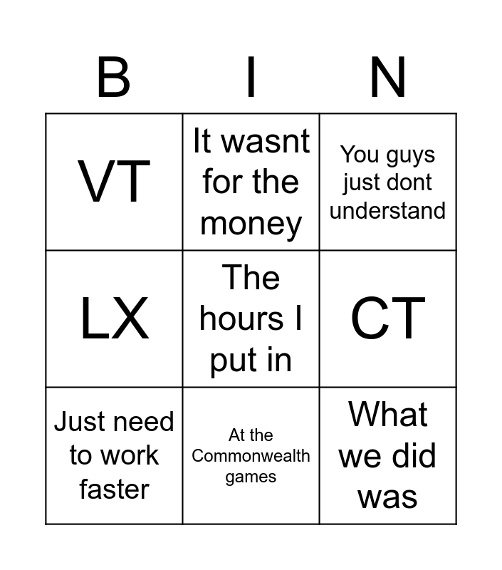 This bingo card has a free space and 11 words: When I was in Birmingham, At the Commonwealth games, What we did was, Just need to work faster, It wasnt for the money, You guys just dont understand, CT, Pyro, LX, VT and PA.