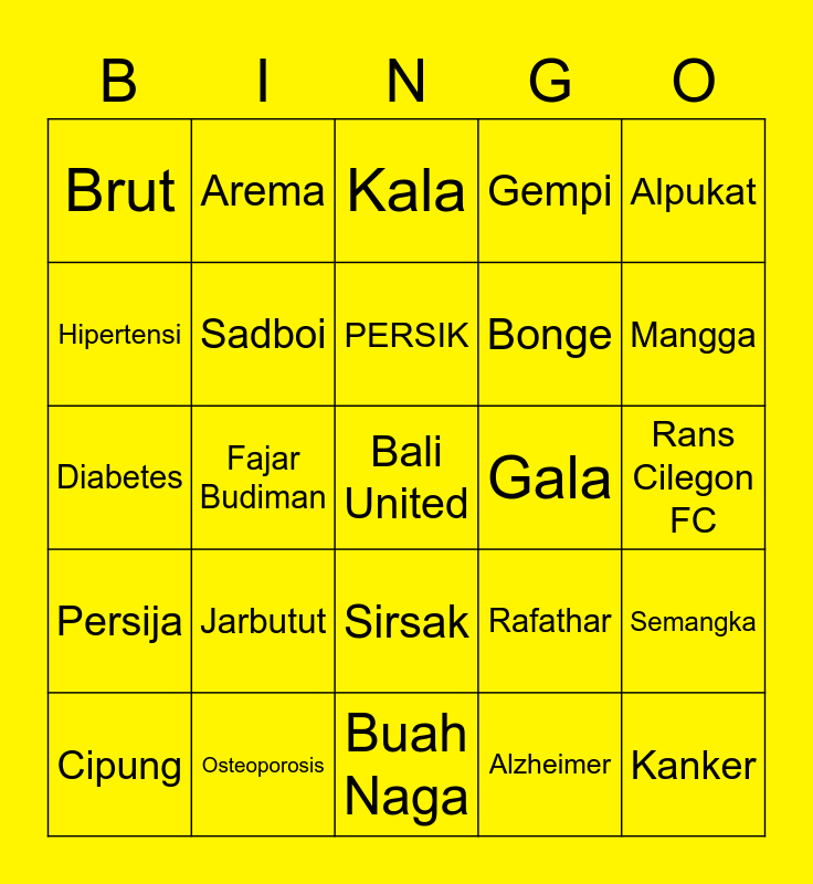 This bingo card has a free space and 24 words: Jarbutut, Osteoporosis, PERSIK, Cipung, Alpukat, Brut, Hipertensi, Arema, Gala, Sirsak, Bonge, Diabetes, Rafathar, Semangka, Sadboi, Alzheimer, Rans Cilegon FC, Kala, Mangga, Fajar Budiman, Kanker, Persija, Gempi and Buah Naga.