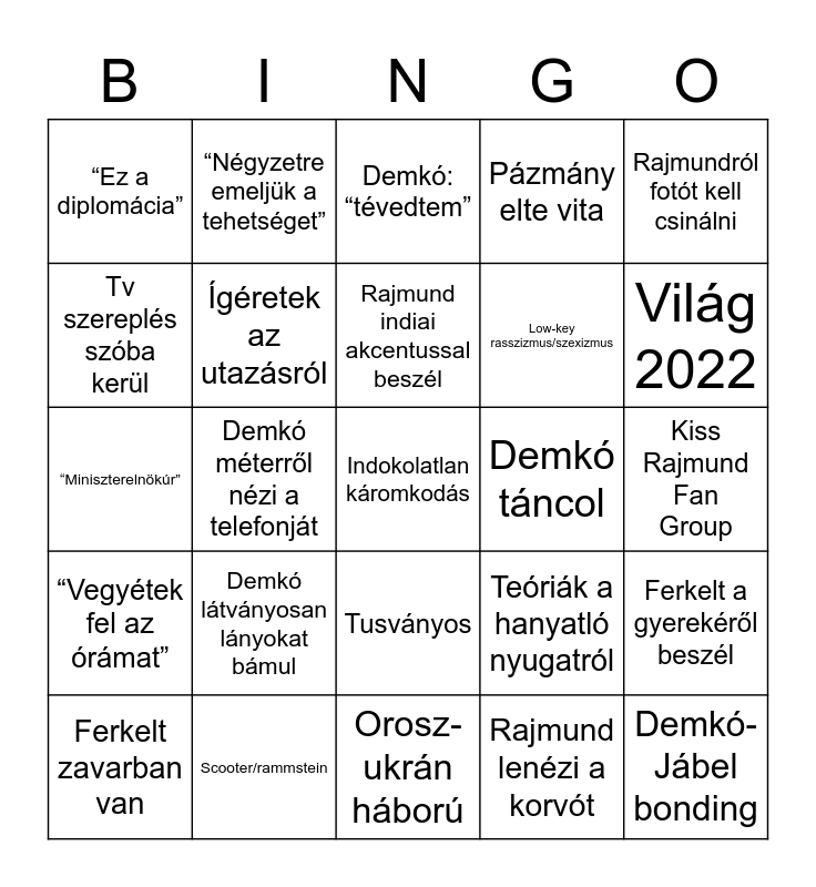 This bingo card has 25 words: Demkó látványosan lányokat bámul, Orosz-ukrán háború, Rajmund indiai akcentussal beszél, Ferkelt zavarban van, Rajmundról fotót kell csinálni, “Ez a diplomácia”, Tv szereplés szóba kerül, “Négyzetre emeljük a tehetséget”, Demkó táncol, Tusványos, Low-key rasszizmus/szexizmus, “Miniszterelnökúr”, Teóriák a hanyatló nyugatról, Ferkelt a gyerekéről beszél, Ígéretek az utazásról, Demkó-Jábel bonding, Kiss Rajmund Fan Group, Demkó: “tévedtem”, Világ 2022, Demkó méterről nézi a telefonját, Indokolatlan káromkodás, Scooter/rammstein, “Vegyétek fel az órámat”, Pázmány elte vita and Rajmund lenézi a korvót.