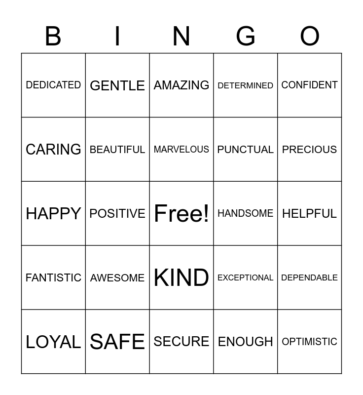 This bingo card has a free space and 24 words: AWESOME, SAFE, MARVELOUS, LOYAL, CONFIDENT, DEDICATED, CARING, GENTLE, HANDSOME, KIND, PUNCTUAL, HAPPY, EXCEPTIONAL, DEPENDABLE, BEAUTIFUL, ENOUGH, HELPFUL, AMAZING, PRECIOUS, POSITIVE, OPTIMISTIC, FANTISTIC, DETERMINED and SECURE.