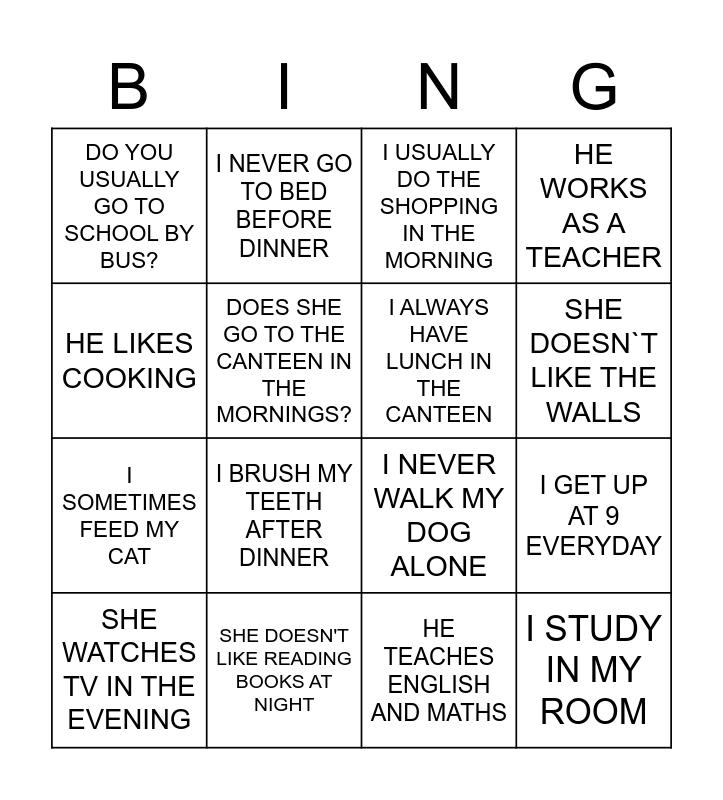 This bingo card has 20 words: I GET UP AT 9 EVERYDAY, I HAVE BREAKFAST IN THE MORNING, I USUALLY DO THE SHOPPING IN THE MORNING, I DO MY HOMEWORK IN THE AFTERNOON, SHE WATCHES TV IN THE EVENING, HE LIKES COOKING, SHE DOESN'T LIKE READING BOOKS AT NIGHT, DO YOU USUALLY GO TO SCHOOL BY BUS?, I SOMETIMES FEED MY CAT, I NEVER GO TO BED BEFORE DINNER, I BRUSH MY TEETH AFTER DINNER, I NEVER WALK MY DOG ALONE, DOES SHE GO TO THE CANTEEN IN THE MORNINGS?, I STUDY IN MY ROOM, I ALWAYS HAVE LUNCH IN THE CANTEEN, SHE LIKES THE WALLS, SHE DOESN`T LIKE THE WALLS, HE WORKS AS A TEACHER, HE TEACHES ENGLISH AND MATHS and MUSIC OS MY FAVOURITE SUBJECT.