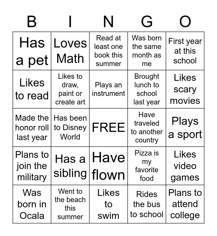 This bingo card has a free space and 24 words: Has a sibling, Went to the beach this summer, Plays an instrument, Was born in Ocala, First year at this school, Has a pet, Likes to read, Loves Math, Have traveled to another country, Have flown, Brought lunch to school last year, Made the honor roll last year, Pizza is my favorite food, Likes video games, Likes to draw, paint or create art, Rides the bus to school, Plays a sport, Read at least one book this summer, Likes scary movies, Has been to Disney World, Plans to attend college, Plans to join the military, Was born the same month as me and Likes to swim.