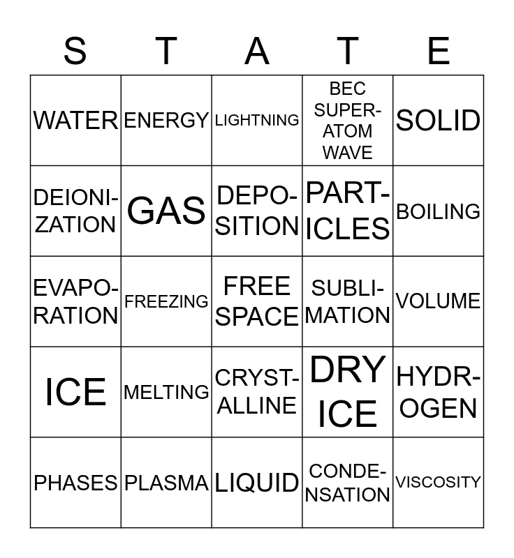 This bingo card has a free space and 24 words: MELTING, PLASMA, DEPO-SITION, PHASES, SOLID, WATER, DEIONI- ZATION, ENERGY, SUBLI- MATION, CRYST- ALLINE, PART- ICLES, EVAPO-RATION, DRY ICE, HYDR- OGEN, GAS, CONDE- NSATION, VOLUME, LIGHTNING, BOILING, FREEZING, VISCOSITY, ICE, BEC SUPER- ATOM WAVE and LIQUID.