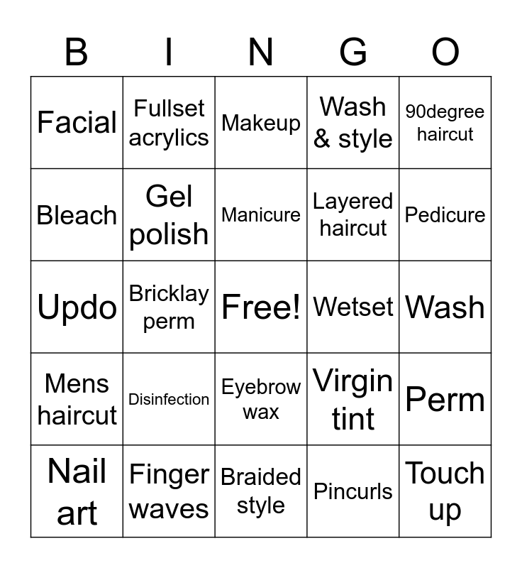 This bingo card has a free space and 24 words: Disinfection, Finger waves, Manicure, Nail art, 90degree haircut, Facial, Bleach, Fullset acrylics, Wetset, Eyebrow wax, Layered haircut, Updo, Virgin tint, Perm, Gel polish, Pincurls, Wash, Makeup, Pedicure, Bricklay perm, Touch up, Mens haircut, Wash & style and Braided style.