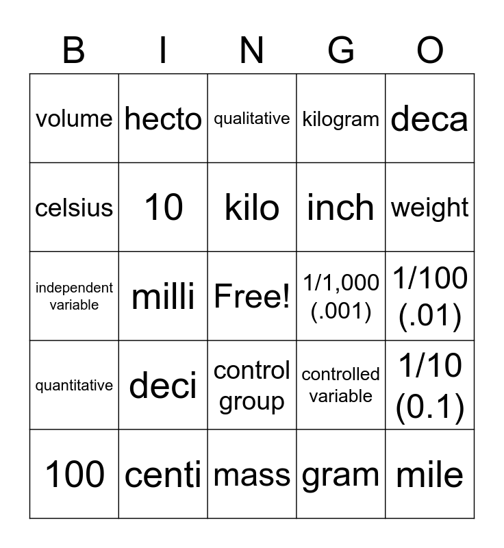 This bingo card has a free space and 32 words: gram, dependent variable, milli, 1, quantitative, 10, deca, 1/10 (0.1), hecto, 1,000, kilo, qualitative, hypothesis, liter, 1/1,000 (.001), meter, 100, independent variable, control group, deci, controlled variable, experimental group, 1/100 (.01), centi, mile, kilogram, inch, celsius, volume, mass, distance and weight.