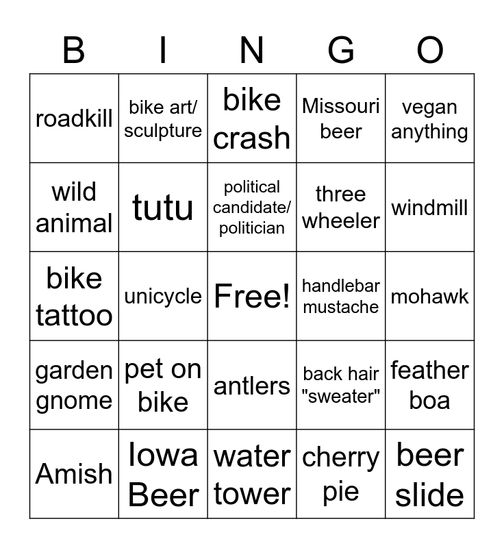 This bingo card has a free space and 38 words: breakfast burrito, Margaritaville, dance-off, tutu, feather boa, pet on bike, political candidate/ politician, deep fried anything, vegan anything, three wheeler, unicycle, Missouri beer, beer slide, mohawk, wild animal, garden gnome, Wisconsin beer, bike crash, blueberry pie, handlebar mustache, roadkill, Iowa Beer, windmill, Amish, turkey leg, water tower, mullet, beer pong, scarecrow, pull along stereo, train caboose, antlers, cherry pie, bike art/ sculpture, clown, back hair "sweater", bike tattoo and celebrity.